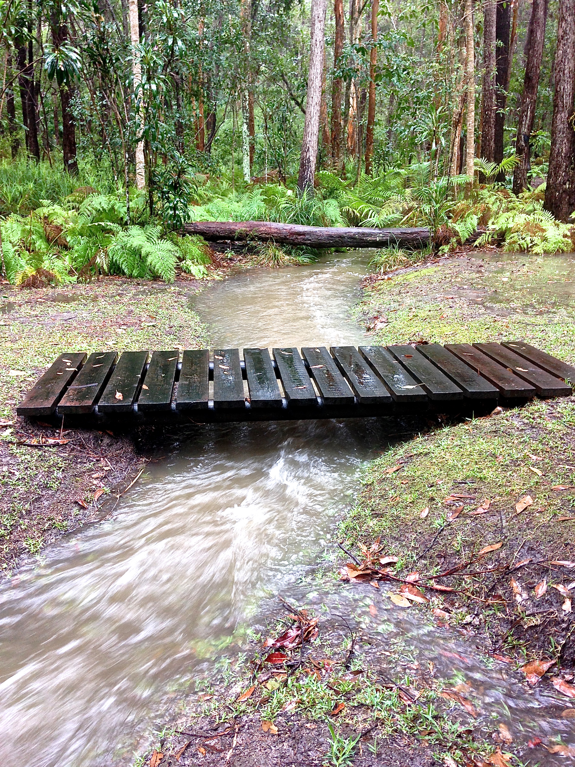 Wake-up garden, it is raining ; For the past four months I have been waiting patiently for it to rain. For most of that time I have also been waiting for the builder to construct the rustic bridge to connect the garden’s newly opened pathway through the rainforest. Last Saturday, in drizzling rain, the bridge came to fruition over the dry creek-bed. I was very excited to finally link my pathways from one bridge to another. Then the rains came. I held my breath as a trickle started then grew and grew until my little dry creek came alive and began to flow freely. The garden that I have nurtured through the drought is now freshly washed with green shoots sprouting everywhere. The garden has come alive. Thank you rain.
